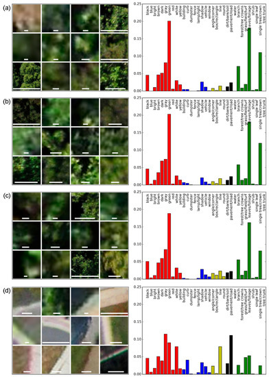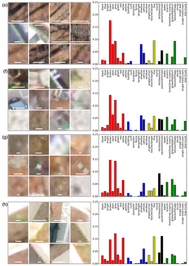 (a–h) Exemplar cluster feature tiles (left) and frequency distributions (right) of tags per image feature cluster for leaf-on aerial point clouds. Tiles are those closest to cluster centroid. White bars indicate original tile size. Bar color represents tag category: red = colors, blue = objects, yellow = shapes, black = other surfaces, green = vegetation.