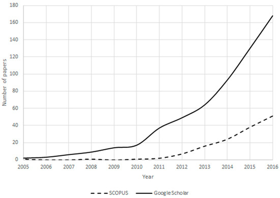 Earth Observation (EO) is the collection of information about the Earth’s surface using remote sensing and in situ surveying on the ground [1]. Hence, it encompasses imagery from a range of satellite sensors, aerial imagery from airplanes and increasingly unmanned aerial vehicles, as well as permanent ground-based sensors and field-based measurements collected using handheld sensors, digital questionnaires or using paper-based formats. Once the domain of only professionals, the field of EO has seen new inputs coming from Citizen Science (CS), which is the involvement of citizens in scientific research, from data collection through to hypothesis generation [2]. This is clearly reflected in the increasing number of publications that have appeared in the area of EO and CS as shown in Figure 1, which is based on a search of the terms ‘Earth Observation’ and ‘Citizen Science’ in both Scopus and Google Scholar.