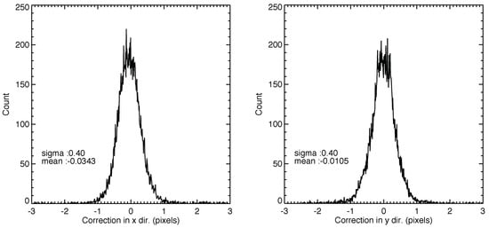 With this scheme, large regions with variable surface velocity and no low/zero-motion areas may require additional calibration because a change in speed between the reference map and the actual scene may bias the calibration. Such regions include Thwaites Glacier in West Antarctica or Larsen C Ice Shelf in the Antarctic Peninsula for example. Our solution for these areas is to concatenate the Sentinel-1 scenes into long tracks where areas of low motion are found systematically and we then use these long tracks to calibrate shorter Landsat-8 or Sentinel-1a scenes. In principle, the Landsat-8 offset maps require no additional calibration if the images are accurately geocoded. Thus, the distribution of correction we apply to the data is directly linked to the quality of the geocoding (Figure 1). We find that Landsat images are georeferenced with a precision of 0.0 ± 0.4 pixel, or 0.2 ± 6.0 m in both x- and y-direction, which is consistent with the geolocation accuracy derived by [28]. If not properly corrected, a geocoding error of 0.4 pixel would introduce an error in velocity measurement ranging from 137 m/year for 16-day to 5 m/year for 368-day passes.