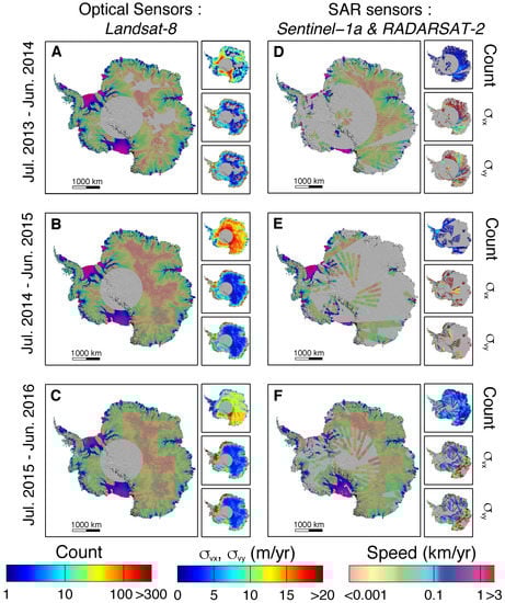 Annual mosaics of surface ice speed generated from Landsat-8 (A–C) and the SAR sensors Sentinel-1 and RADARSAT-2 (D–F) in Antarctica. The figure is constructed as a matrix, the 3 rows representing the different years surveyed (2013, 2014, 2015) and the 2 columns representing the different sensors (optical and SAR). The ice velocity is coded on a logarithmic scale overlaid on MOA background mosaic [32]. Each velocity map is accompanied by 3 additional panels representing the number of velocity measurements (top), the weighted standard deviation in x- (middle) and y-direction (bottom). Standard deviations are calculated when 3 or more velocity measurements are present and replaced by the weighted standard error when less than 3 measurements are found.