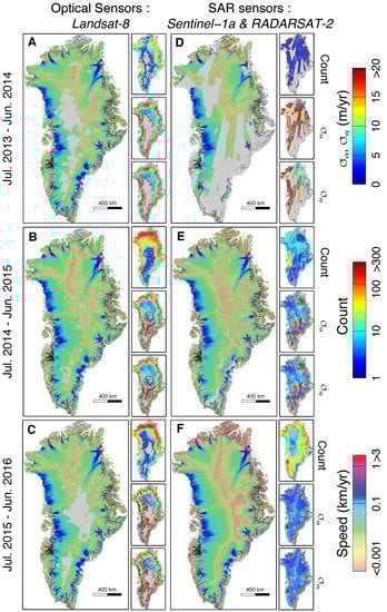 Annual mosaics of surface ice speed generated from Landsat-8 (A–C) and the SAR sensors Sentinel-1 and RADARSAT-2 (D–F) in Greenland. The figure is constructed as a matrix, the 3 rows representing the different years surveyed (2013, 2014, 2015) and the 2 columns representing the different sensors (optical and SAR). The ice velocity is coded on a logarithmic scale overlaid on MOG background mosaic [33]. Each velocity map is accompanied by 3 additional panels representing the number of velocity measurements (top), the weighted standard deviation in x- (middle) and y-direction (bottom). Standard deviations are calculated when 3 or more velocity measurements are present and replaced by the weighted standard error when less than 3 measurements are found.