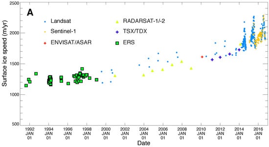 Ice speed of Zachariae Isstrøm between 1992 and 2017 (A) and between 2014 and 2017 (B) from multiple sensors. Landsat prior to 2013 were downloaded from NSIDC [37].