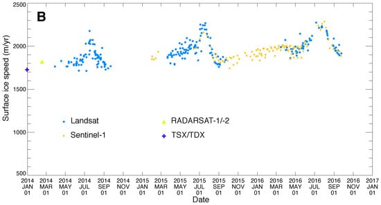 We note that all ice motion measurements being discussed here use feature tracking (Landsat-8) or speckle tracking (SAR). This technique is limited by the size of the pixel element (or resolution cell of the data) and data noise. With SAR sensors, however, it is possible to measure ice motion with the interferometric phase instead [12,17,42,43,44,45]. The precision of ice motion from the phase is not limited by the pixel size, but by the size of the radar wavelength and data noise. In effect, SAR sensors measure ice motion within millimeters using the phase, or typically one order magnitude better than with tracking [46]. In that case, given the same amount of data and the same pixel size, SAR sensors offer vastly superior quality for ice motion measurements. On the other hand, phase measurements need to be completed along two independent directions (or three if we do not assume surface parallel flow [14]) in order to resolve the vector of ice motion, hence require more data acquisition and tracks [47]. With the interferometric phase, SAR sensors also detect differential movements of the ice surface, e.g., the subtle flapping of floating sections up and down with changes in oceanic tides [41,48], or the deflation of the ice surface because of drainage of a subglacial lake, at a precision of a few millimeters, which is currently impossible to achieve from optical sensors or altimeters and is a unique capability of SAR sensors. The use of phase data however require twice more data compared to the correlation technique ascending and descending acquisitions are needed. The current SAR sensors (Sentinel-1, RADARSAT-2, TSX) are not ideal for using the phase on a large scale because of their limited coverage and/or their operational mode of acquisition which is not optimum for phase analysis.
