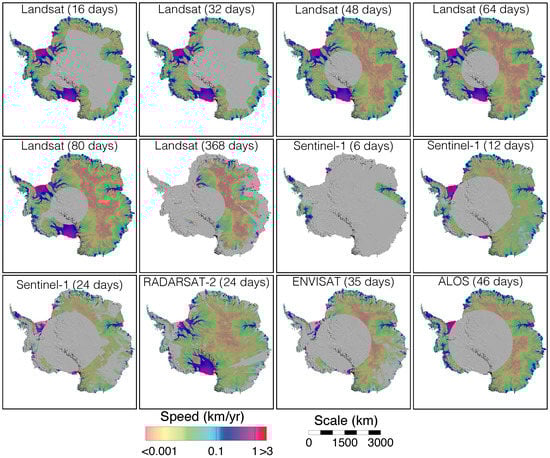 Antarctic ice speed maps for each sensor and each cycle separately. The ice speed is coded on a logarithmic scale overlaid on MOA background mosaic.
