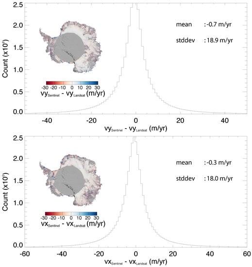 Distribution of the difference between the velocity maps from Sentinel-1 and Landsat-8 for year 2014–2015. The velocity component and are displayed on the bottom and top panels, respectively.