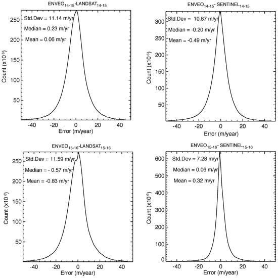 We also compare our mosaics (Figure 3) with the ENVEO’s (http://www.enveo.at/) ice velocity mosaic products of Greenland published by [19] for year 2014–2015 and 2015–2016 from Sentinel-1 acquisitions. We find that the ENVEO’s velocity maps are in good agreement with our Landsat-8 and Sentinel-1 mosaics. The distribution of the difference between the absolute ice speed from ENVEO minus the results from this study is shown in Figure 8. Typically, the mean differences between ENVEO and this study for year 2015–2016 are 0 ± 11 and 0 ± 7 m/year for Sentinel-1 and Landsat-8, respectively.