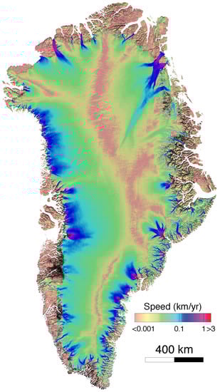 - Rignot, E.; Mouginot, J. Ice flow in Greenland for the International Polar Year 2008-2009. Geophys. Res. Lett. 2012, 39, L11501. [Google Scholar] [CrossRef]
