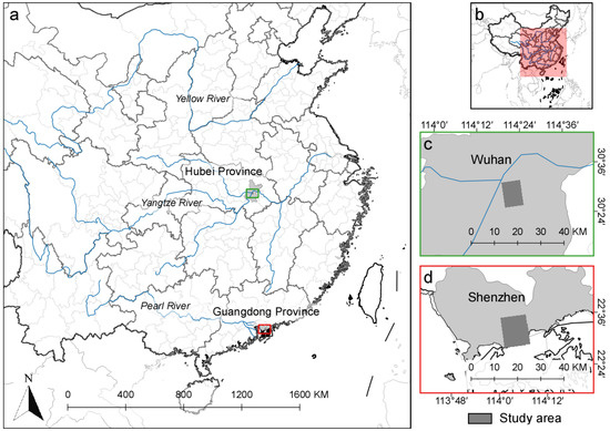 Study areas: (a,b) the overview; (c) km × km Wuhan study area in Hubei province; (d) km × km Shenzhen study area in Guangdong province.