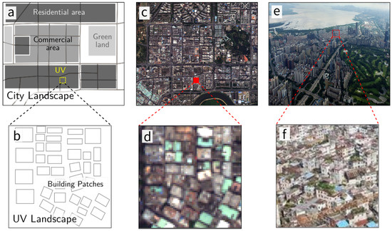 UVs were originally rural settlements. Engulfed by expanding cities, they no longer neighbor farmland, but instead are surrounded by various urbanized areas, such as commercial areas with skyscrapers and formal residential areas, which constitute the city together with UVs (Figure 2a,c,e). Due to the absence of proper planning and management, UVs mainly feature low and crowded buildings, which were constructed by villagers and are now rented to migrants and low-income groups (Figure 2b,d,f). Accordingly, open space and green land are scarce in UVs compared to other urban areas. Hence, we can identify UVs from high-resolution remote sensing images according to the composition and configuration of the land cover, especially buildings.