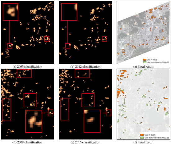 We applied the proposed method to all images, and Figure 4 shows the raw classification results and the multi-temporal extent of the UVs for Shenzhen and Wuhan, where the extent of UVs has been manually refined based on multiple groups of classification results. Because we used half-overlapped scenes as classification units, the resolution of raw classification results is 60 m, half of the scene size (Figure 3). The main changed areas are shown in rectangles. The UVs showed a large reduction in area in Wuhan from 2009–2015, while the change in Shenzhen is relatively small. A further quantitative analysis of the UVs can be found in Section 4.2.