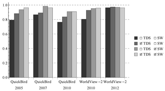 Average Kappa values produced in the classification of the Shenzhen images with four different settings, where TDS and SW respectively mean whether target domain samples and sample weighting were used in the classification.