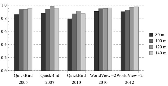 The scene size used in the above experiments was fixed, i.e., 120 m. Because UVs have different sizes and shapes, the scene size does affect the results. To evaluate the effect quantitatively, we classified the Shenzhen images with three other scene sizes, i.e., 80 m, 100 m and 140 m. In the experiments, the training samples were not changed because the metrics used for classification (Table 3) were unrelated to the scene size, i.e., a metric value computed for a UV scene of 80 m was comparable to that computed for a UV scene of 140 m (there were actually two exceptions, i.e., number of patches (NP) and number of core areas (NCA), and we normalized their values according to the scene size). Meanwhile, the sizes of the original test samples (i.e., scenes) were changed from 120 m to 80 m, 100 m and 140 m accordingly, and their center positions were kept unchanged. According to our selection criterion, the test samples were pure scenes at 120 m, and their labels should remain consistent from 80 m–140 m.
