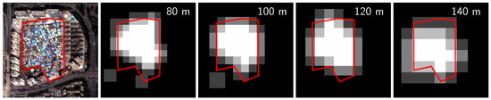 To realize the conceptual hierarchical landscape model and apply the landscape metrics in practice, we need to create the corresponding landscapes and patches in the context of remote sensing images. (1) City-UV: The study area is the city landscape. As one of the major products of this study, accurate UV patches are not available before they are identified from remote sensing images. Alternatively, we use the moving window strategy to divide the city landscape into square sub-landscapes, which are hereinafter referred to as “scenes” (Figure 3). The scene size is 120 m, which is empirically chosen (Section 4.1.3). The scenes are then identified as UVs/non-UVs by the composition and configuration of the land cover. For the further landscape pattern analysis, accurate UV patches are created by manually refining the detection results. (2) UV-building: Every UV patch in the city-UV structure can be viewed as the landscape in the UV-building structure. To create building patches for the UV landscape, we employ the morphological building index (MBI) [44,45,46] for unsupervised and rapid extraction from the high-resolution images, which has been used in a number of recent studies including built-up area detection [47] and urban change detection [48]. We also create vegetation patches using the normalized difference vegetation index (NDVI). Since buildings are dominant in UVs, vegetation patches are not used for analyzing the UV landscape, but to help differentiate UV scenes from others (the percentage of UV areas in the city landscape (PLAND), mean patch size (MPS) and patch size standard deviation (PSSD) in Table 3 are computed for the vegetation patches).