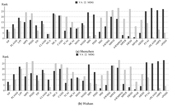 We computed the metric significance with the proposed method (Section 3.2) and converted the numeric values to ordinal numbers, i.e., the ranks of metric significance, where a metric of rank #1 means it is most significant among all metrics in the classification according to the measure (MDG or VA) used. Metrics with the same definition but different parameters were merged, and we finally had 25 metrics related to building patches and three metrics related to vegetation patches (i.e., vPLAND, vMPS and vPSSD).