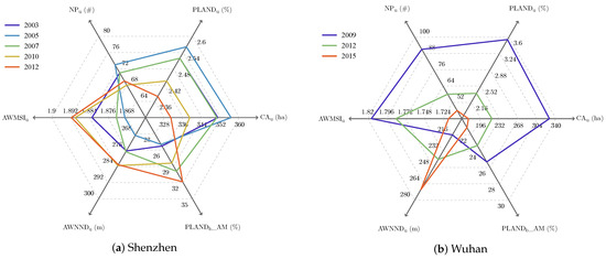 Figure 9 illustrates the evolution of UVs at the city scale with metrics in Group II (Section 3.3.4). On the one hand, a similar trend can be observed for the two cities, i.e., a shift of the ring from upper right to lower left, which is mainly caused by the decreasing area (i.e., CA) and number (i.e., NP) of UVs and the increasing distance between UVs (i.e., AWNND) in the whole city. On the other hand, there are two noteworthy differences between Shenzhen and Wuhan. Firstly, the UVs in Wuhan experienced a more radical demolition program than in Shenzhen. About half of the UVs were demolished in Wuhan study area from 2009–2015, while less than 6% of the UVs in Shenzhen were demolished from 2003–2012. Secondly, the inner built-up development of UVs (i.e., PLAND_AM) in Wuhan decreases consistently with their total area and number, while this is the opposite in Shenzhen. The reasons behind the city-level changes are discussed in Section 5.2.