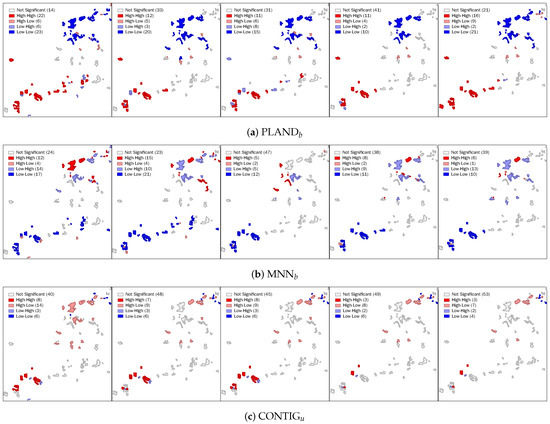 Using the global Moran’s I (Section 3.3.4), we found significant spatial auto-correlation of some metrics, which are mainly related to the UV-building structure (Table 6). In Shenzhen, PLAND, ED, NCA and MNN show a significant positive spatial auto-correlation, i.e., if a UV has a high/low built-up intensity, its neighbors also tend to have a high/low built-up intensity. In Wuhan, such consistent global spatial auto-correlation is not observed.