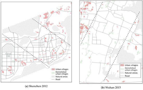 In this study, we experimented with the urban areas of Wuhan and Shenzhen (Figure 1), two typical cities accompanied with a large number of UVs in recent decades. Wuhan, situated at the confluence of the Yangtze and Han rivers, has been the capital of Hubei province and the largest city in Central China for centuries. It is one of the most populous metropolitan cities in China. Shenzhen is a very young city, which is situated in the Pearl River Delta, one of the most developed areas in China. It became the first Special Economic Zone of China in 1979 and has experienced swift economic development and extraordinary city expansion and population inflow since then [26,35]. The two cities have different socioeconomic backgrounds and urbanization patterns, which also affect the development of UVs.