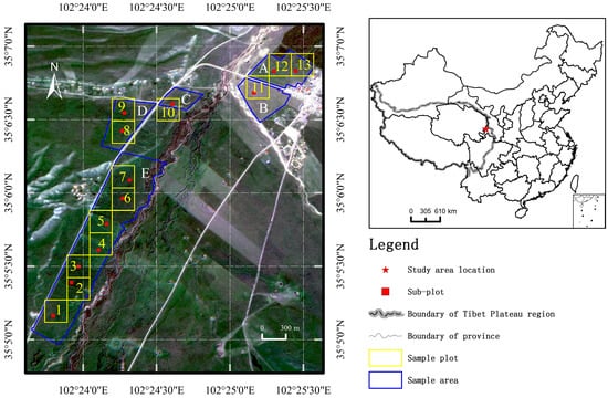 Distributions of experimental sample areas (A–E), with sample plots (yellow squares) and sub-plots (red small squares with their identification numbers as yellow), in Xiahe County, Gansu Province. Each sample area has a similar situation of grass growth; each sample plot is a MODIS pixel of 250 m × 250 m; each sub-plot is a 30 m × 30 m plot with five sample quadrats (see the details in Section 2.2).