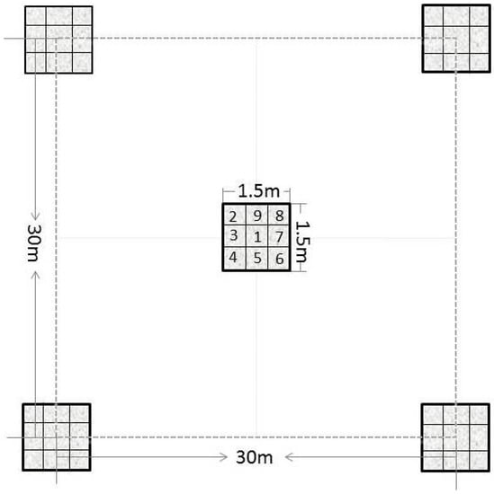Distributions of the five quadrats (1.5 m × 1.5 m each) in each sub-plot of 30 m × 30 m. Each quadrat consists of 9 sub-quadrats of 0.5 m × 0.5 m. The sub-quadrat identification number (1–9) is the order that we used to sample grass each time, e.g., Sub-quadrat 1 was used the first time of any year, 2 was used in second time of the same year, etc.