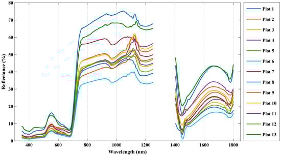 The spectral curves of 13 sample plots on 28–29 July 2014.