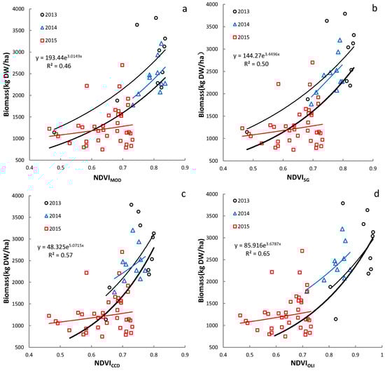 For the period of field sampling in August 2013, July 2014 and July, August and September 2015, the NDVIMOD, NDVIGA, NDVILO and NDVISG were used to construct the grassland AGB models, and the performance of the models was assessed using the field measurements.