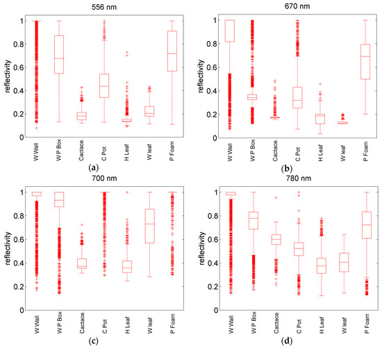 Normalized spectral reflectance variation of seven targets on four wavelengths: (a) 556; (b) 670; (c) 700; and (d) 780 nm. The upper, bottom edge, and middle line of the box represent the 25th and 75th percentiles, and the median of the point cloud, respectively. The length of the dotted line is 1.5 times that of the box unless the end of dotted line contains all external points. Outliers are marked with crosses.