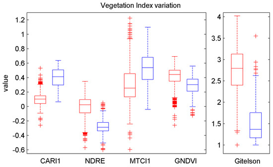 Variation of the five types of vegetation indexes of healthy (red) and withered (blue) scindapsus leaves: Chlorophyll Absorption Reflectance Index 1, Normalized Difference Red Edge, Modified Triangular Vegetation Index 1, Green Normalized Difference Vegetation Index, and Gitelson. The upper, bottom edge, and middle line of the box represent the 25th and 75th percentiles, and the median of the VI value, respectively. The length of the dotted line is 1.5 times that of the box unless end of the dotted line contains the external point. Outliers are marked with red crosses.