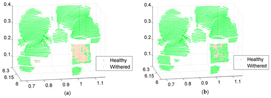 In addition, there were many error points at the edges of targets. For example, some points along the edges of the cactus were classified as healthy scindapsus leaves, and some points on the edges of the white wall were also falsely classified. Two main reasons explain these errors: first, the normal vector of the surface changes at the edge of the targets. Thus the scattering solid angle correspondingly changes, and a factor in raw spectral reflectance [55]. Second, the foot point of the beam may illuminate two or more targets simultaneously at the edges, and the echo reflectance combines echoes from different targets. Therefore, these types of points are difficult to classify and should be classified using spectral mixture analysis.