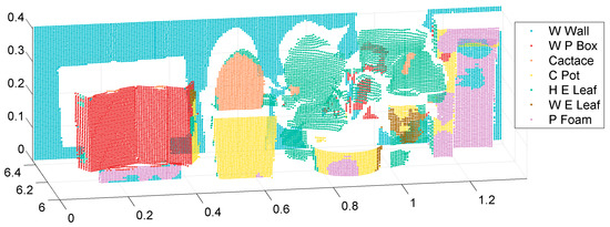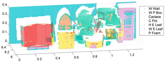 The experimental materials were in decimeter scale and placed at a horizontal distance of six to six and a half meters from the MWCL receiver. The materials were lined up in front of a white wall. The height and length of the point cloud was 0.41 and 1.39 m. A photo and a MWCL point cloud of the experimental scene are shown in Figure 1 and Figure 2.