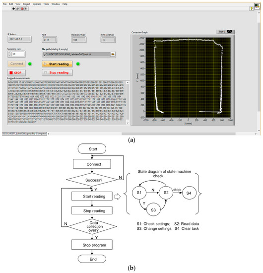 Custom software for data acquisition was developed using LabVIEW 2014 (National Instruments Inc., Austin, TX, USA). The front panel and flowchart of the block diagram are shown in Figure 2. A finite-state machine (FSM) was used in the event-driven custom software so the configurations can be changed without stopping the program. The FSM is a mathematical abstraction machine that can store one of a finite number of states at any given time and change from one state to another in response to external inputs. Compared to the commercial software SOPAS (SICK Open Portal for Application and Systems Engineering) which is commercially available software for communication, configuration and data logging, the developed software can be easily extended and customized. For example, it is easy to integrate extra sensors into the system or develop new data processing functions in the software.