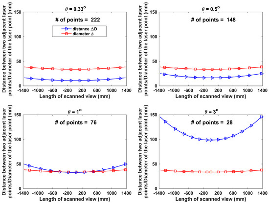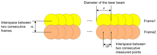 Similar to angular resolution, the interspace between two consecutive frames ∆L, which is the sampling resolution along the direction in which the sensor is moving, should be less than the diameter of the laser beam. ∆L can be determined by Equation (8):