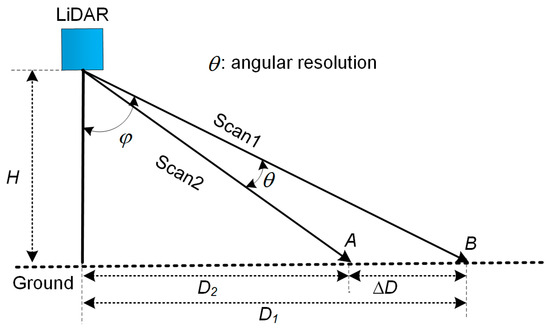 Figure 4 shows a geometric model to determine the angular resolution of LiDAR. A and B are two adjacent measured points. Distances from LiDAR to these two measured points are OA and OB, respectively. Let θ be the configured angular resolution, the angle , and H the mounting height of LiDAR (Figure 4). The laser diameter of measured points A and B can be calculated using Equation (2), and the interspace between the measured points A and B using Equations (3)–(5). D2 and D1 are the distances from the LiDAR to points A and B, respectively, in the horizontal direction.