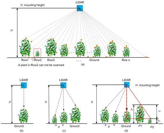 In Equations (6) and (7), d is the interspace between two adjacent rows; N is the number of rows simultaneously scanned; H is the mounting height of LiDAR; h1 and h2 are the height of plants p1 and p2, respectively; and ∆h = h1 − h2, the difference between the heights of plants p1 and p2. Here, the extreme situation is that h1 is the height of the tallest plant, and h2 equals zero, which means there is no plant at the p2 position.