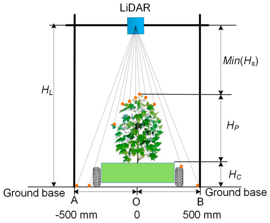 where Hp is the height of the cotton plant; HL is the mounting height of the LiDAR (HL = 1803 mm); HC is the height of the cart (HC = 328 mm); and min(HS) is the minimum distance between the LiDAR and the plant (or the maximum plant height), measured by the point cloud.