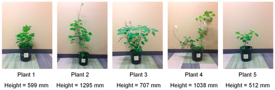 The system should be able to fully scan cotton plants of various heights within a plausible range. Therefore, the plants used for the lab tests were different heights. The tallest and shortest plants represent the two extreme situations. In lab experiments, the tallest plant was plant 2 with a height of 1295 mm, and a height of 0 mm was used as the shortest plant, which meant that the seed was not geminated. For the lowest height situation, the LiDAR scanned the ground base.