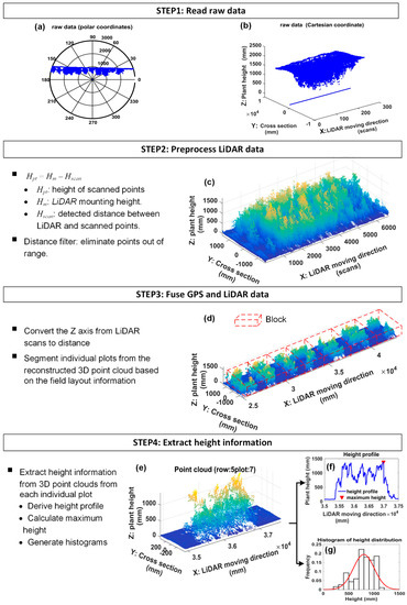 Figure 10 illustrates the data processing pipeline for the LiDAR data. Four steps were contained in the method: