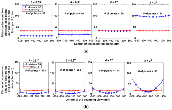 The varying pattern of the laser beam diameter and the distance between two adjacent laser points across a 1000 mm long scanning plane for lab tests at (a) the ground base level (0 mm), and (b) a height level of 1623 mm. The LiDAR was at the height of 1803 mm.