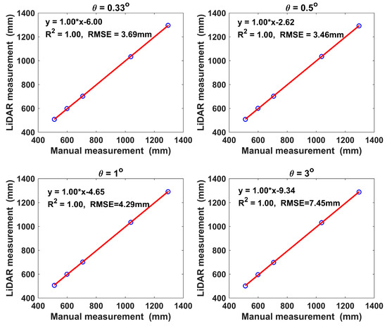 Height measurement results (Table 3 and Figure 12) in the lab were in a good agreement with the analysis in Section 2.2. The system achieved high accuracies for angular resolutions of 0.33°, 0.5°, and 1°, while performance decreased when the angular resolution was 3° (Table 3). For the correlation analysis (Figure 12), although the R2 value was the same for four different angular resolutions, the RMSE for 3° was 7.45 mm which was significantly larger than the value for the other three angular resolutions. If the angular resolution is too low, gaps between two laser points may emerge and this may result in poor measurement performance; if the angular resolution is too high, more storage space and computing resources are needed since more points are generated even though these points may not contribute to enhancing measurement accuracy. Therefore, 0.5° angular resolution was chosen for the lab tests.