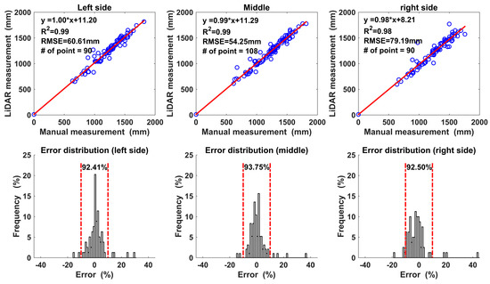 Correlation and error analysis between LiDAR and manual measurements. Two vertical dashed lines in the histograms indicate the ±10% error range.
