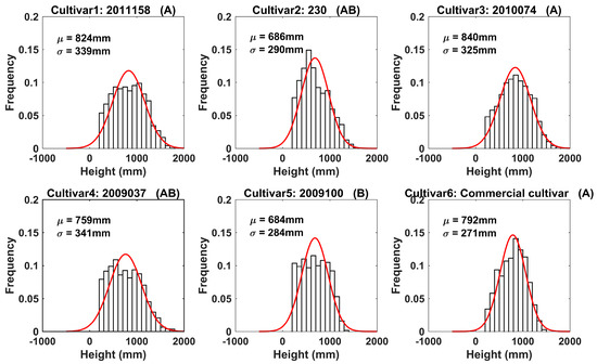 Height histograms for six cotton cultivars. Cultivars with the same letter in the title are not significantly different.