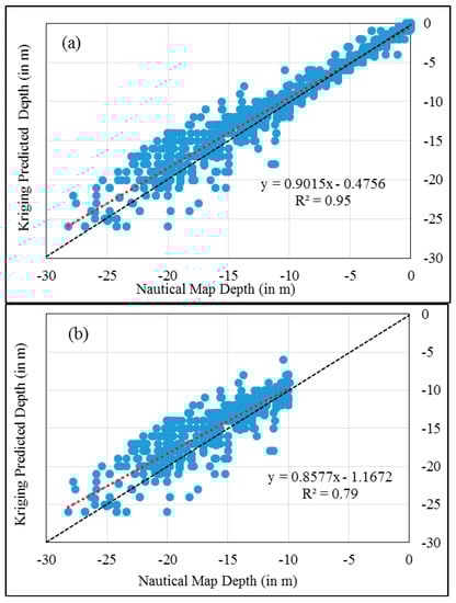 In the framework of this study, we conducted the validation procedure in two different steps. First, the cross-validation process between the measured depths with MBES-CARIS and the predicted depth for the same points using SK. This step is so important and helpful for spatial prediction to assess how well the estimation of unknown point’s works (i.e., calculate the prediction errors and eliminate undesirable points). Second, is the validation by reference to the real water depths, which was performed using a medium scale (1:100,000) nautical map established in 1997 by British navy in cooperation with the Kingdom of Bahrain, Department of Hydrographic Services-Ministry of Environment (Figure 5). This map was established in accordance with the IHO standards with the accuracy of ±0.30 m and ±1.00 m, respectively, for depths between −0 and −30 m and depths between −30 and −100 m [59].
