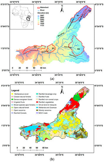(a) Location of the Mara Basin. Elevation zones are based on the 30-m Shuttle Radar Topographic Mission (SRTM) Digital Elevation Model (DEM) along with the location of watersheds (W1–W5) with different landscape and climatic characteristics; (b) land-cover classes of the Mara Basin based on the Africover map [17]. The stripped polygons depict locations where the Normalized Vegetation Index (NDVI) is extracted.