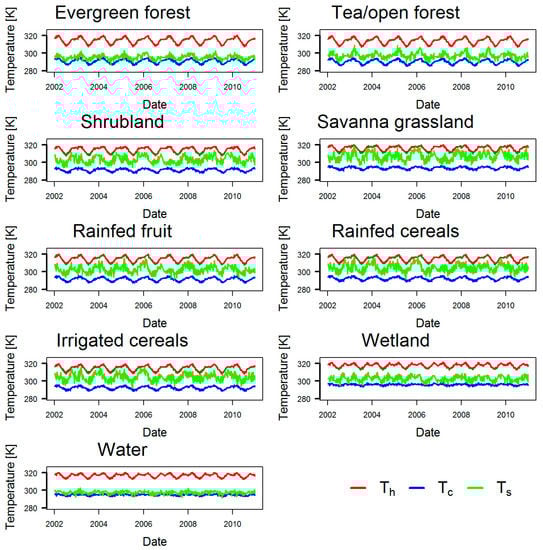 where rah is the aerodynamic resistance to heat transfer from a hypothetical dry, bare surface (110 s/m), ρα is the density of air (kg/m3) and cp is the specific heat of air at constant pressure (1004 J/kg/K). The calculations of the net radiation under clear-sky conditions are based on Allen et al. [42], and the reader is referred to Senay et al. [9] for a detailed description of the SSEBop parameterization. Figure 3 shows the dynamics of the clear sky Ts, Tc and Th (i.e., Tc + dT) for selected land-cover classes from 2002–2010. It is important to note that dT, as well as the reference temperatures are unique for each period (daily in this study) and location, but the value does not vary from year to year since it is calculated under a clear-sky condition.