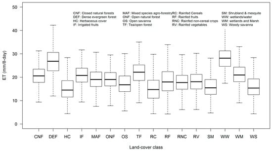 Boxplot of the eight-day aggregated ET (2002–2010) across different land cover classes over the Mara Basin. The vertical boxes represent the interquartile range, while the horizontal line shows the median ET.