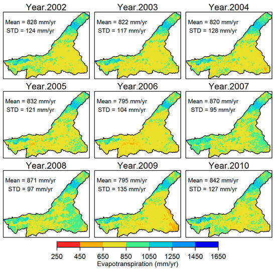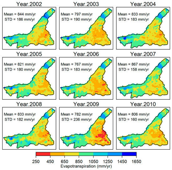 Figure 5 illustrates the annual basin ET distribution at the 1-km spatial scale. It is apparent from annual ET maps that (i) ET is low in the eastern portion of the basin and (ii) the head water and the river mouth regions show consistently high ET values. At the basin scale, the nine-year mean annual ET is about 817 (±32) mm/yr; the low standard deviation (STD) indicates minimal inter-annual variability. However, as shown in Figure 5, the high STD magnitudes at the 1-km spatial scale signify the existence of significant spread in ET across the basin. Furthermore, we observe in Figure 5 that the basin experiences low annual ET values in 2006 (767 mm) and 2009 (782 mm). These estimates are consistent with the observed drought in 2005/2006, due to a short rain failure [61], and in 2009, due a delayed onset of the long rains [62] in Kenya. This suggests that the ET estimates are reliable in the sense that they are able to capture climatic variation (in this case drought).