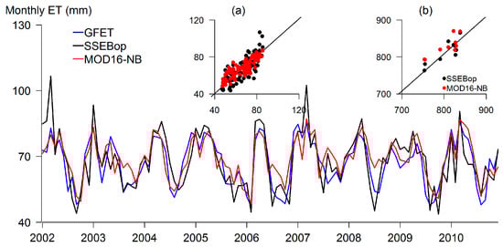 Figure 6 presents the comparison of basin-scale monthly SSEBop ET and MOD16-NB against the reference GFET for the period of 2002–2010. Visually, we observe that our SSEBop ET and MOD16-NB reproduced well both the magnitude and temporal dynamics of monthly GFET. This is supported by a high statistically-significant linear correlation of 0.80 (0.86), a PBIAS of 1.1% (2.8%) and an RMSE of 0.26 (0.19) mm/d between SSEBop (MOD16-NB) and GFET. As shown in Figure 6, we notice differences in monthly range among the ET products, which could be caused by differences (unlike the others, SSEBop relies on thermal) and similarities (MOD16 and GFET share inputs as noted in Velpuri et al. [11]) in approaches to show a larger dynamics that could imply more sensitivity associated with the role of Ts. Understanding the significance of these differences requires more evaluation in other hydro-climatic settings at multiple spatio-temporal scales.