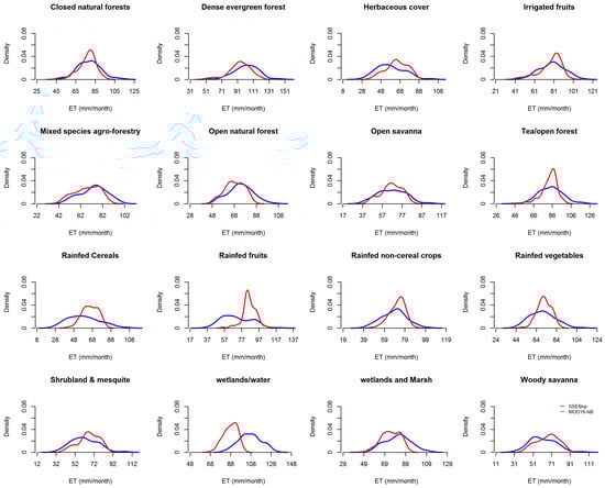 Figure 8 and Figure 9 exhibit the discrepancies between SSEBop ET and MOD16-NB at the pixel and land cover level. MOD16-NB shows higher values of ET (up to 178 mm/yr) as compared to the SSEBop ET for agricultural cover types, as well as herbaceous cover, shrubland and woody savanna. These differences are notable with a shift and skewness of the histogram (see the third row in Figure 9). Similar observations were reported in Velpuri et al. [11]. Their comparisons with observed ET from flux towers showed a better performance of MOD16 for cropland and woody savanna cover than SSEBop, while both models underestimate ET as compared to the observations. Alemu et al. [10] also compared ET for the Nile Basin using MOD16-NB and the U.S. Geological Survey (USGS) SSEBop product for Africa and marked similar observations. On the other hand, our results show that SSEBop ET is higher than the MOD16-NB for wetland and flood plain areas and for forest covers. On average, SSEBop ET is 232 mm/yr higher than MOD16-NB for wetlands or water mixed land cover. Similarly, Alemu et al. [10] showed a large difference for wetlands in the Nile Basin. The SSEBop ET (1286 mm/yr) is comparable with the SEBAL ET estimates for wetlands and swamps in the Upper Pangani Basin (Kenya/Tanzania) (1291 mm/yr) [60], suggesting the better reliability of our estimates.