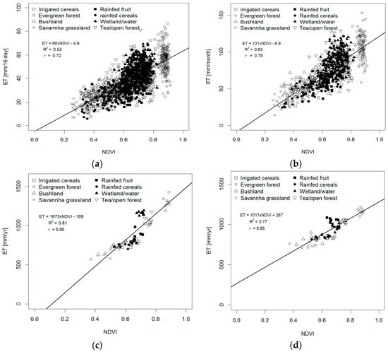 Figure 10a–c shows the relationship between the NDVI and the SSEBop ET at varying temporal aggregation levels for several land-cover classes. The SSEBop ET explains about 52%, 63% and 81% of the observed variability in the NDVI at a 16-day, monthly and annual temporal resolution, respectively. Markedly, we observe weak linear association of NDVI and ET at 16-day and monthly temporal resolution in humid highland regions and semi-arid areas with continuous moisture supply such as wetlands. This result is in agreement with Mutiga et al. [64] who noted a weak correlation between daily NDVI and SEBAL ET for elevations beyond 2100 m.a.s.l. in the upper Ewaso Ng’iro North Basin, Kenya. It is worth noting that ET shows appreciable temporal variability mainly depending on the availability of energy and transport capacity (i.e., wind) in moist regions; however, the NDVI shows less temporal variation. This highlights the weakness of the NDVI as a proxy to ET for shorter temporal scales for areas with sufficient soil moisture storage.