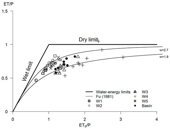 Scatterplot of the evaporative index (ET/P) against the aridity index (ET0/P). The markers represent different watersheds (W1–W5) while the solid lines (thin) show the relationships represented by Fu [57] for w values of 2.7 and 1.9.
