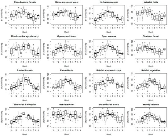 The rainfall (and hence soil moisture) distribution is one of the main governing factors of the seasonality and spatial variability of ET. In this basin, the water year that is based on the rainfall seasonality starts on 1 October and ends on 30 September [16]. Figure 12 illustrates the monthly variability of ET in the Mara Basin. The figure shows that ET is high from October–May, due to the availability of energy and soil moisture during this period. On the other hand, we note a relatively low ET during the dry season months (June–September). However, the land-cover classes located in the humid part of the basin, such as evergreen forest and tea/open forest, show less seasonality since there is ample rainfall throughout the year. Additionally, for wetlands and marsh covers, we observe less monthly variability as there is a continuous supply of water from the Mara River and Lake Victoria. In conclusion, the SSEBop ET estimates reflect fairly well the seasonal rainfall distribution pattern in the basin.
